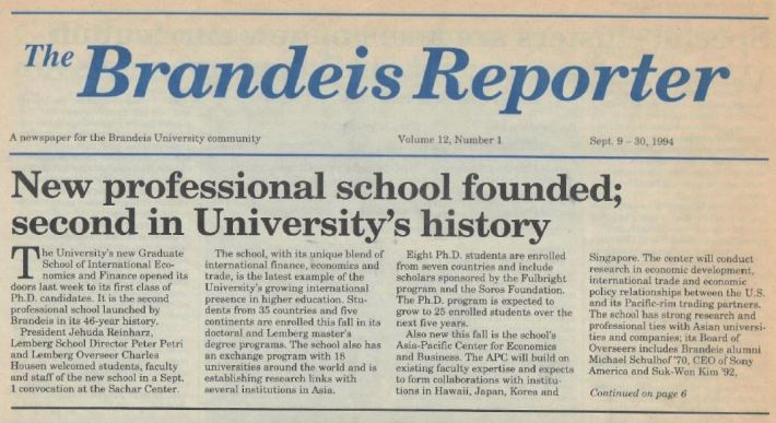 The Lemberg Program met its objectives rapidly and its 1992 Director’s Report proposed expanding the scale and scope of the program within the setting of a new professional school. Although similar to Brandeis’ Heller School in its decision-making structure, the new school would be tightly connected with the Economics Department–a mutually beneficial arrangement that has lasted 25 years. The plan called for expanding the Lemberg Program from 50 to 100 students, adding a new Ph.D. program, hiring faculty, expanding research, and experimenting with executive programs. Several faculty and Trustee committees were involved in reviewing the plans and the Brandeis faculty voted unanimously to establish the new school.