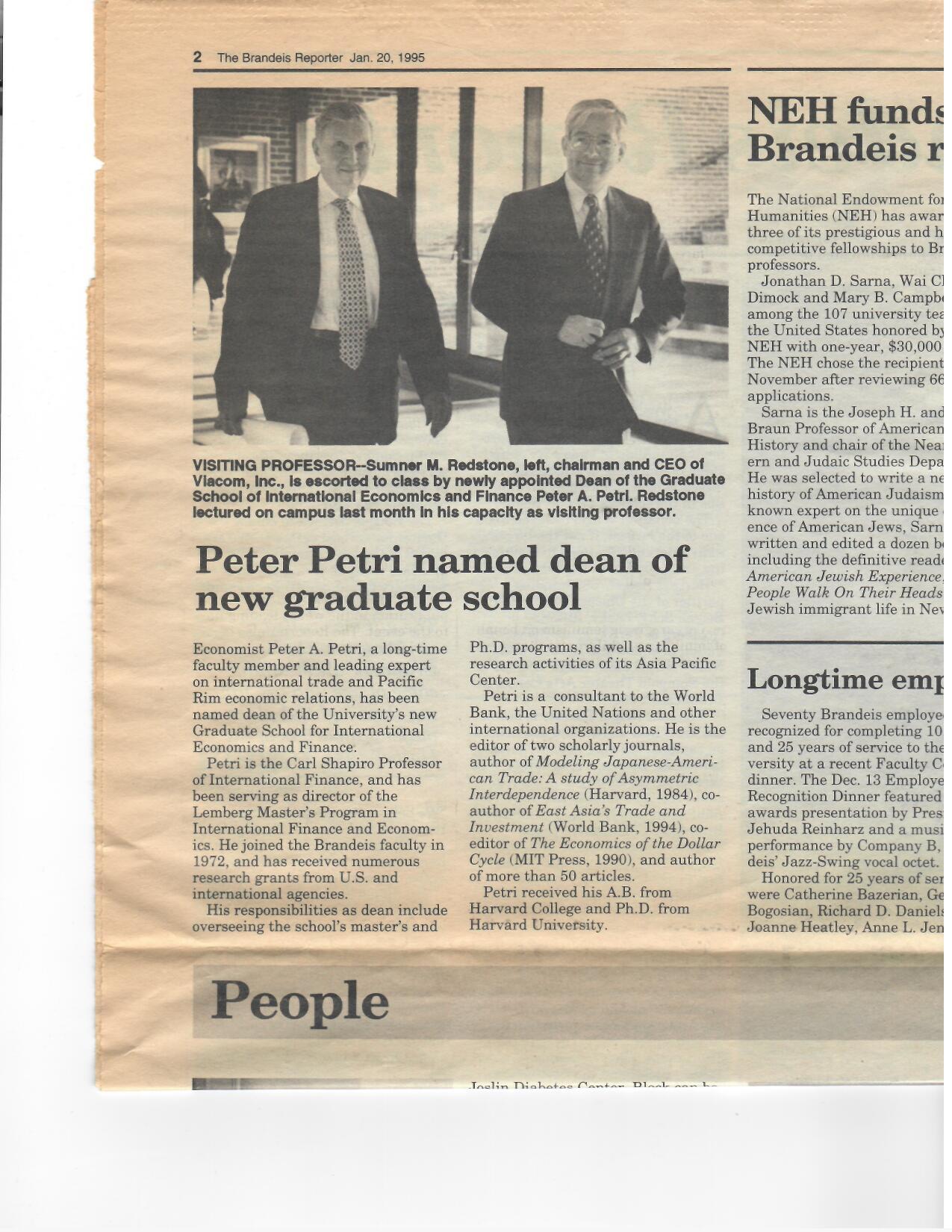 The Lemberg Program met its objectives rapidly and its 1992 Director’s Report proposed expanding the scale and scope of the program within the setting of a new professional school. Although similar to Brandeis’ Heller School in its decision-making structure, the new school would be tightly connected with the Economics Department–a mutually beneficial arrangement that has lasted 25 years. The plan called for expanding the Lemberg Program from 50 to 100 students, adding a new Ph.D. program, hiring faculty, expanding research, and experimenting with executive programs. Several faculty and Trustee committees were involved in reviewing the plans and the Brandeis faculty voted unanimously to establish the new school.