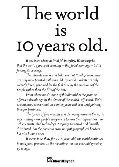 The ad below captures the context. It appeared in major US newspapers in 1999 and identified 1989 as the year when the global economy was born. The underlying changes were the central factor motivating our 1985 proposals.